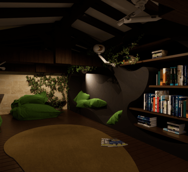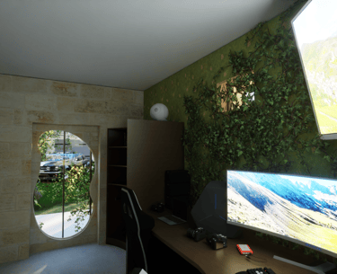 Mise en place de bloc de cinéma, mettant en scène une cuisine et une bibliothèque taillé dans le roche ainsi que d'une salle de bain.