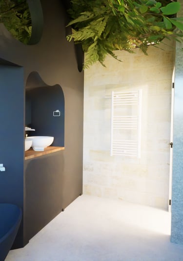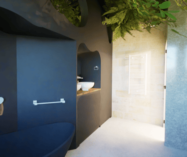 Inspirée des décors de cinéma, la salle de bain intègre une structure en fausse roche sculptée, mettant en scène la baignoire comme une pièce maîtresse. Une atmosphère sculpturale, minérale et apaisante.