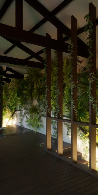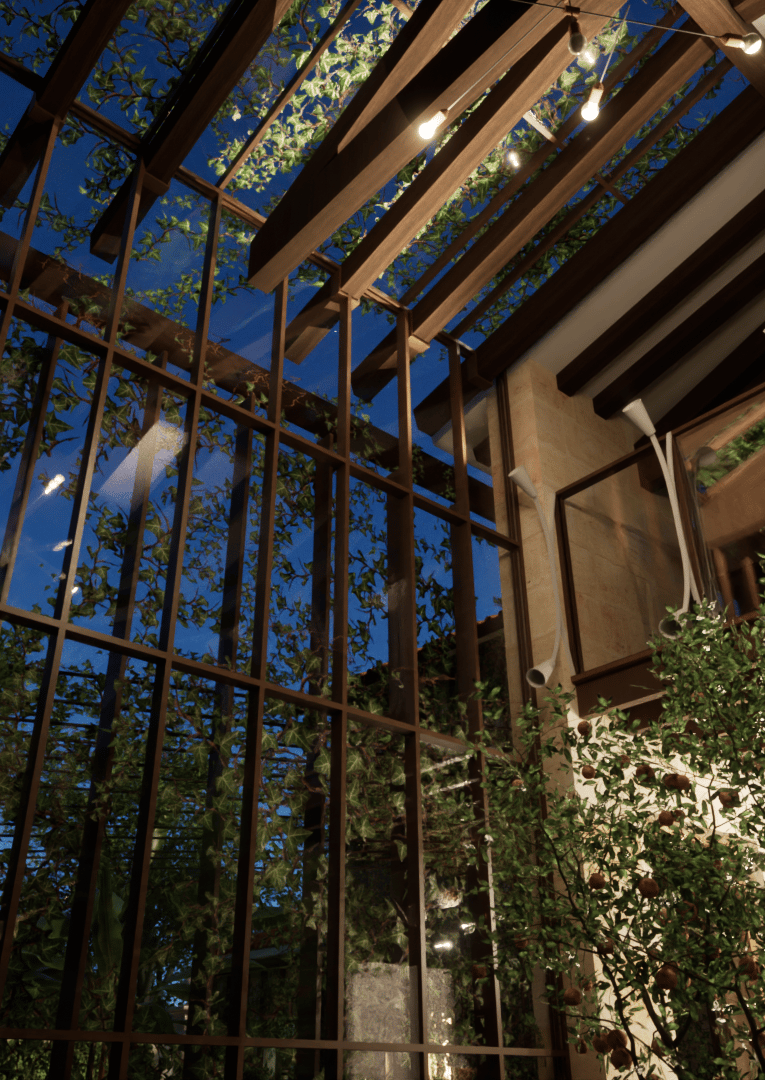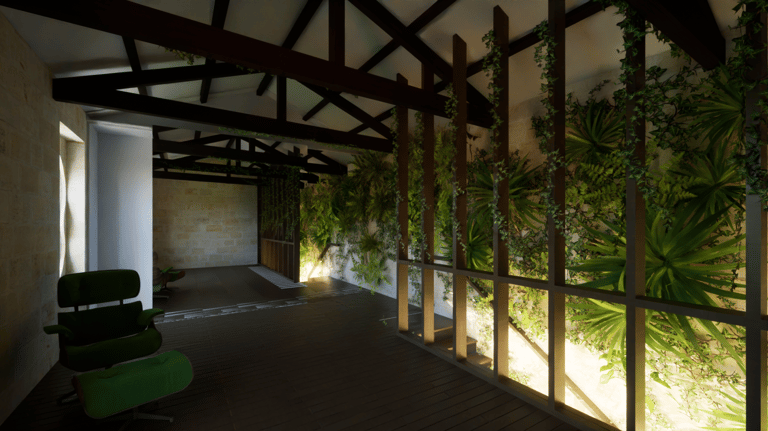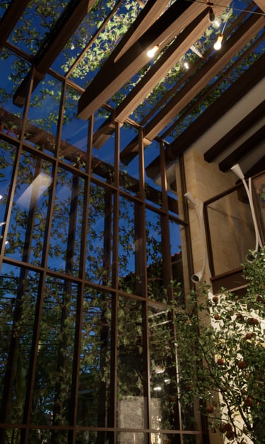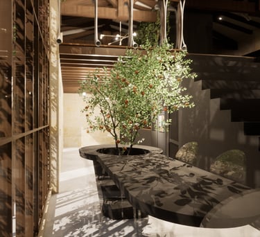 Baignée de lumière grâce à une baie vitrée pleine hauteur, la salle à manger bénéficie d’un microclimat maîtrisé : ouvertures automatiques et régulation naturelle via les plantes offrent un confort thermique idéal.