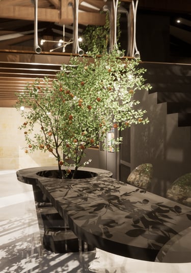 La table de la salle à manger intègre un pêcher, véritable sculpture vivante, capable de produire ses fruits en fonction des saisons.