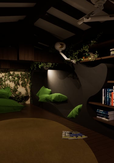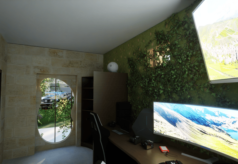 Conçu pour la performance, l’espace bureau accueille un ordinateur de rendu haute capacité. Une étagère sur mesure optimise le rangement du matériel, offrant un équilibre parfait entre fonctionnalité et discrétion.